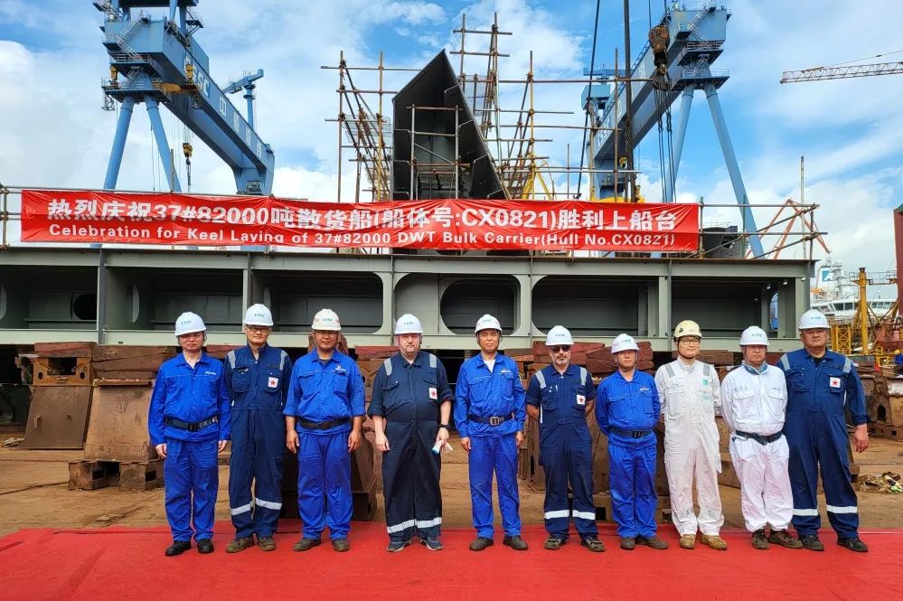 7月22日,中船澄西为中信金融租赁有限公司建造的5号8.45万吨干散货船胜利下水,为NEDA建造的37号8.2万吨散货船基准分段上船台搭载。