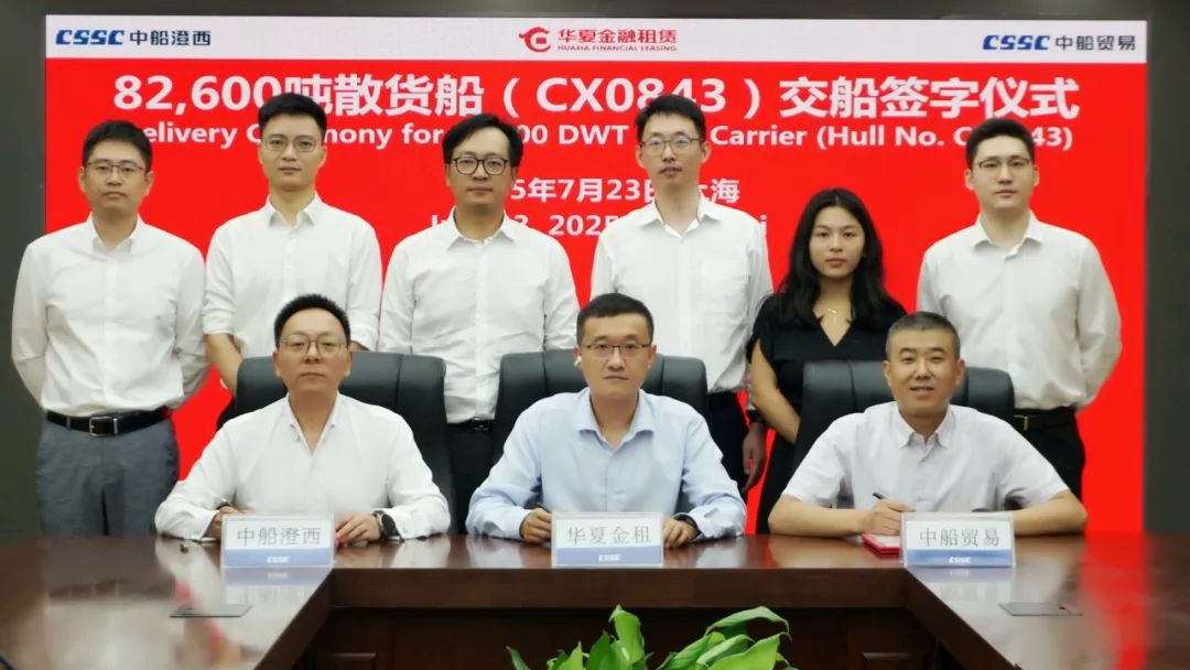 7月23日,中船集团旗下中船澄西船舶修造有限公司为华夏金融租赁有限公司建造的39号8.2万吨散货船“PACIFIC HIBISCUS”轮较合同期提前161天签字交付。同日,为深海技术科学太湖实验室建造的深远海绿色智能技术试验船胜利命名交付。